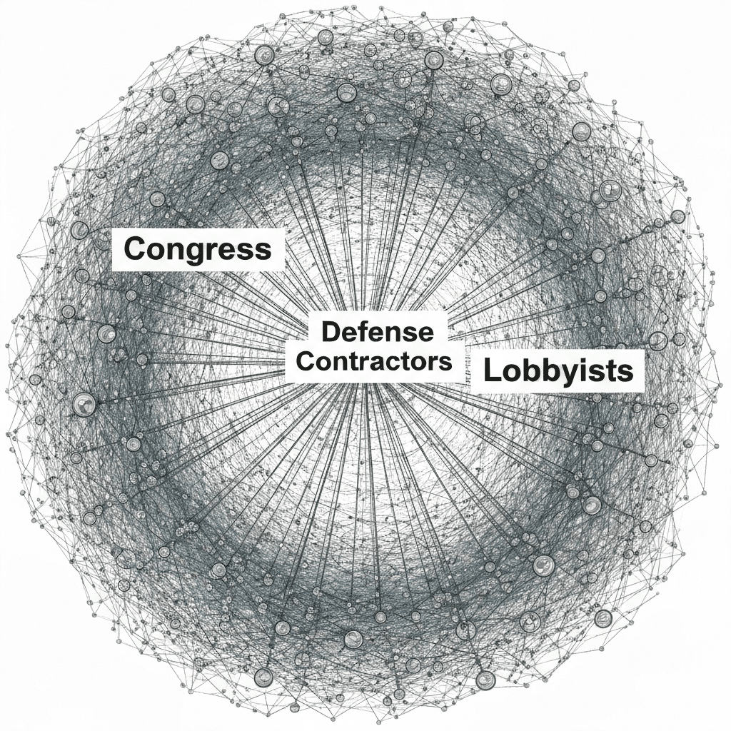 The defense contractor ecosystem reinforces this dynamic. Lobbying budgets, campaign contributions, and revolving-door hiring ensure that defense industry priorities get heard. Program complexity makes cancellation politically and technically difficult. Once a weapons system is in production, killing it means job losses, sunk costs, and political backlash. Vietnam draft dodgers became war hawks for a reason—being pro-military is politically safer than being skeptical.